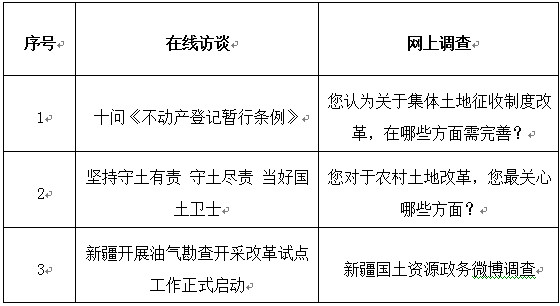 (四)扩大信息公开范围,完善信息更新制度,提高信息更新速度,加大查询服务力度,定期开展访谈直播、网上调查等。2015年,矿业权办理结果信息公开4033条,报件办理状态信息公开5023条,新疆国土资源政务微博更新信息318条。