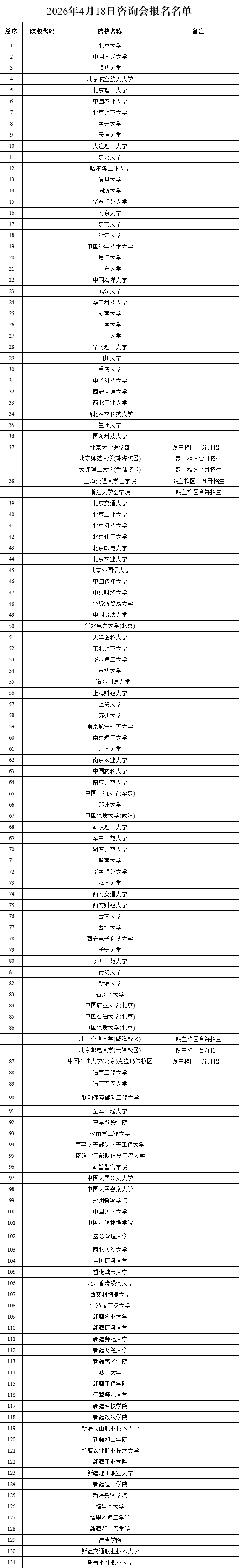 天山网-新疆日报讯(记者 沈祖孝 报道)4月13日,记者从新疆教育考试院获悉,截至目前,已有全国131所疆内外高校报名参加将于4月18日举行的新疆2026年春季高校招生政策宣传咨询会。