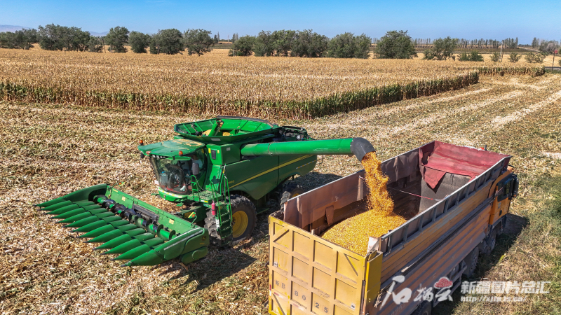 2024年收获季,新疆呼图壁县五工台镇龙王庙村,农机手驾驶收割机收获玉米。陶维明 摄