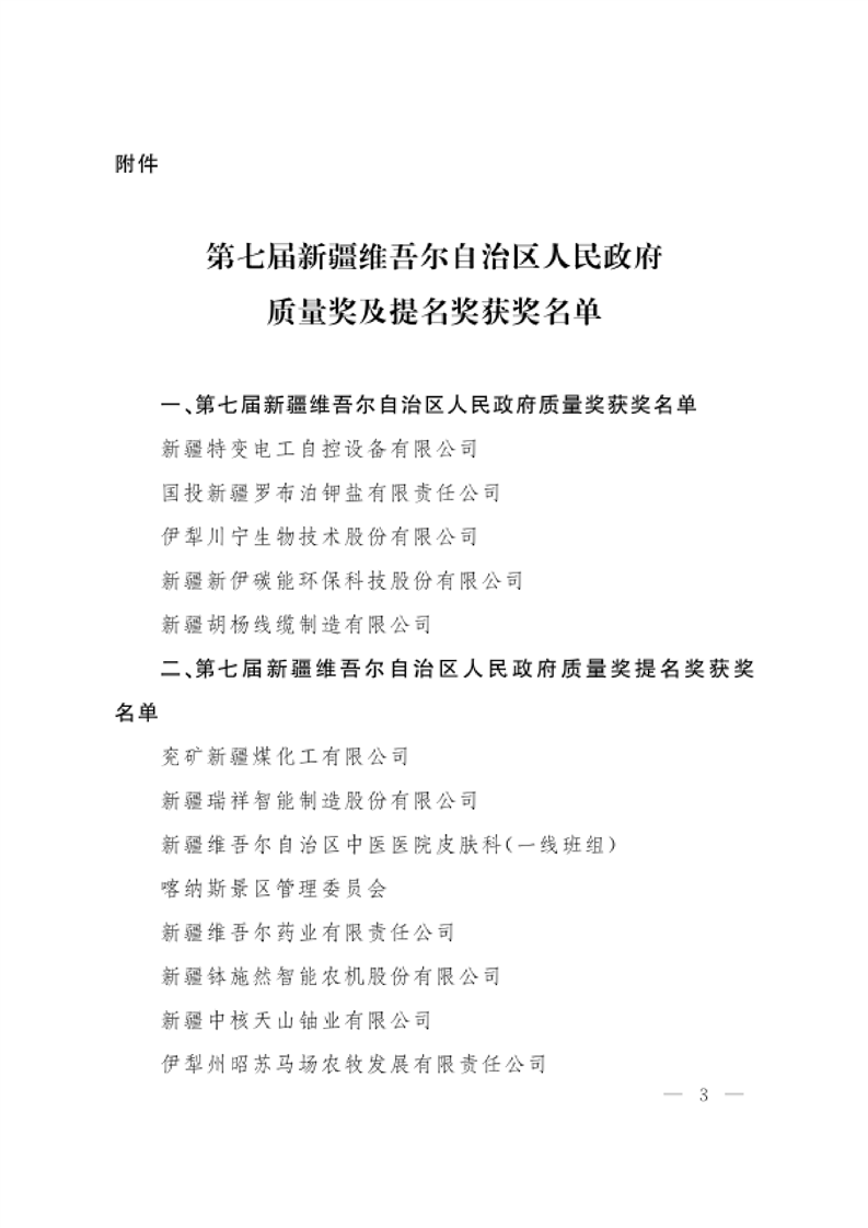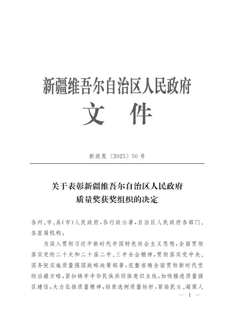 关于表彰第七届新疆维吾尔自治区人民政府质量获奖奖组织的决定