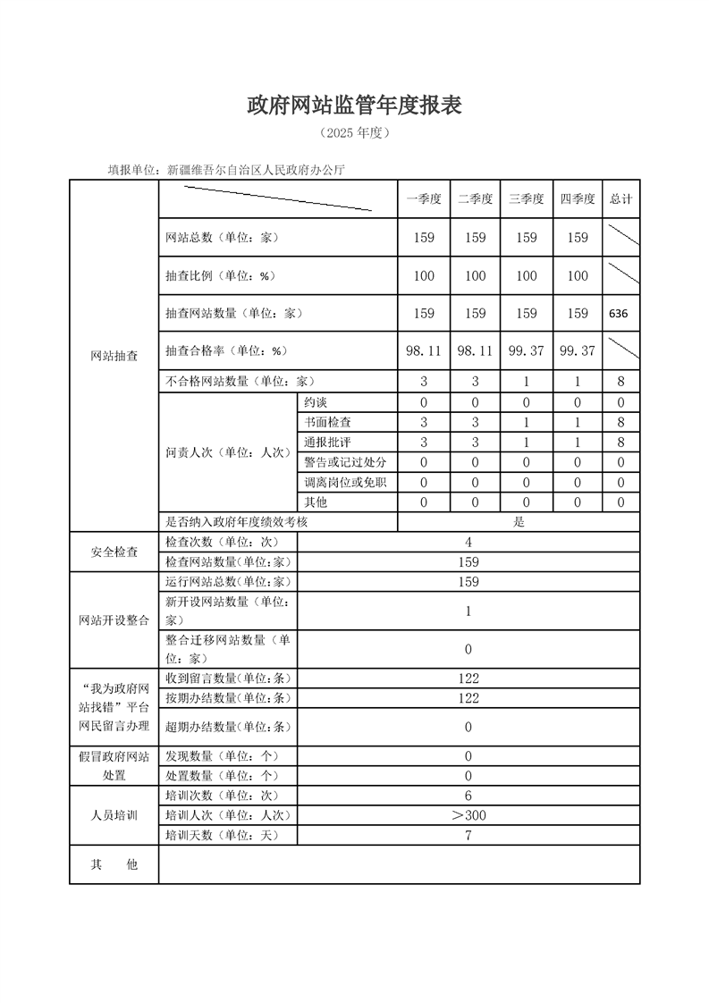 新疆维吾尔自治区2025年度政府网站监管报表