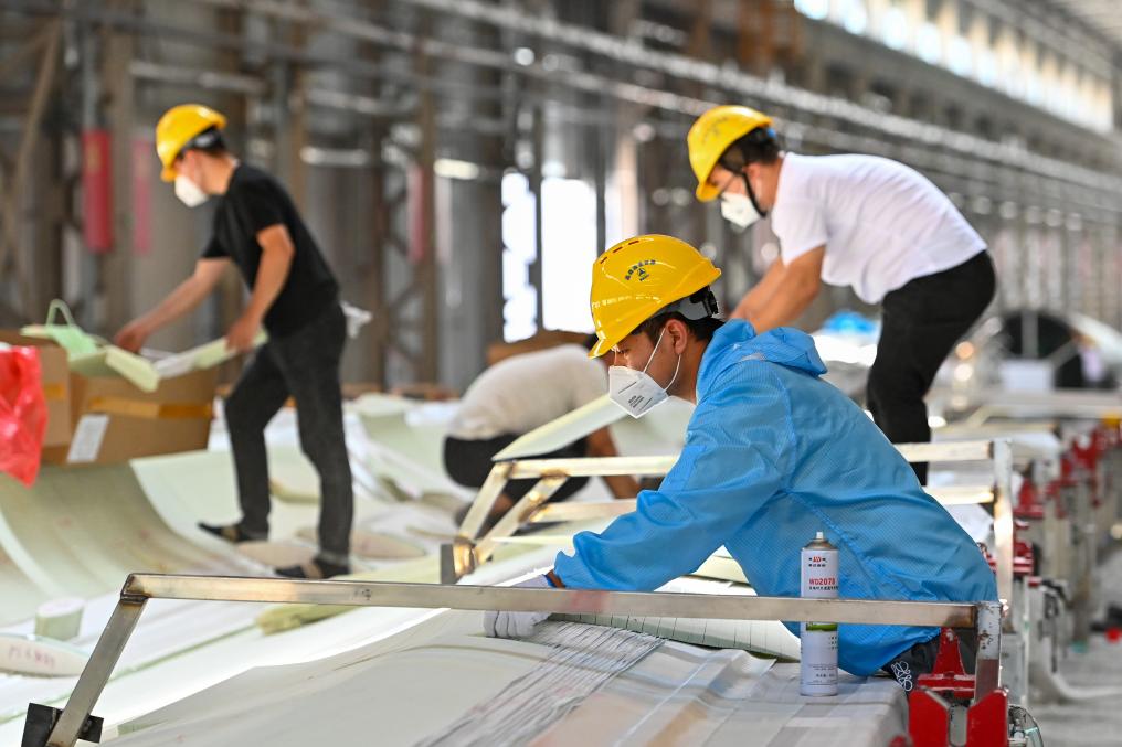 这是2023年7月22日拍摄的在新疆塔城重点开发开放试验区先行发展区三一(塔城)风电设备有限公司,工人在叶片成型车间忙碌。新华社记者 丁磊 摄