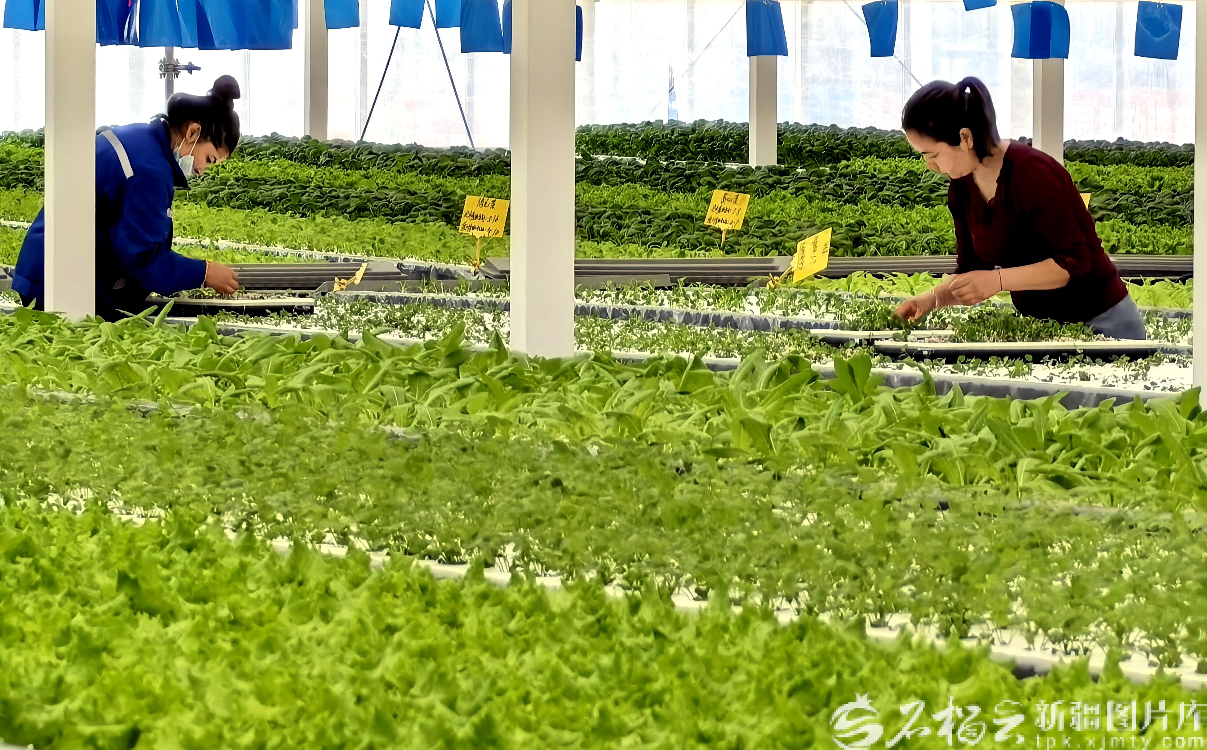 4月14日,库车市玉奇吾斯塘乡甬库同心村智慧农业植物工厂内,工作人员在整理、定植水培叶菜。