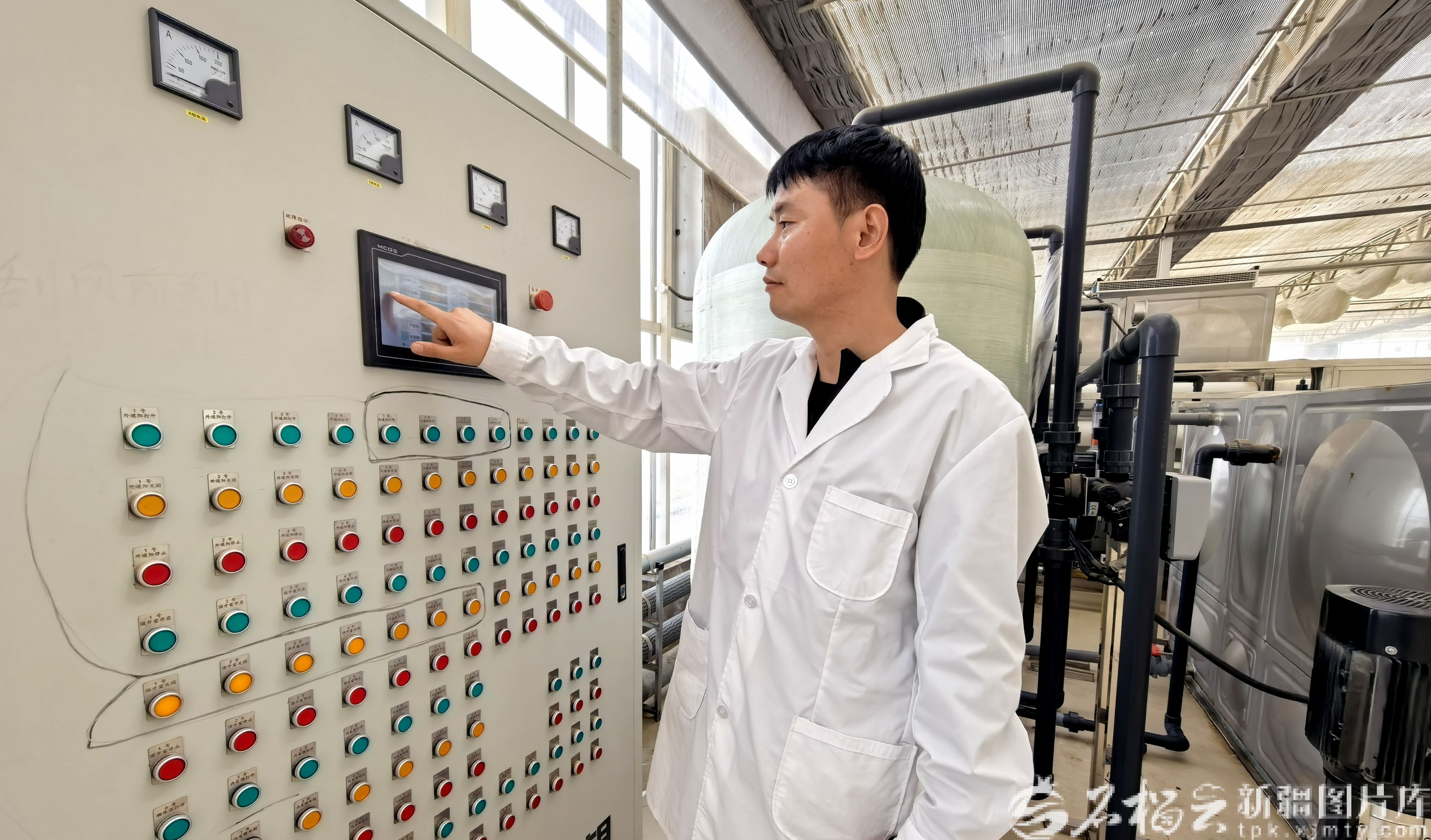 4月14日,库车市玉奇吾斯塘乡甬库同心村智慧农业植物工厂负责人李松松调试营养液循环与供水装置。