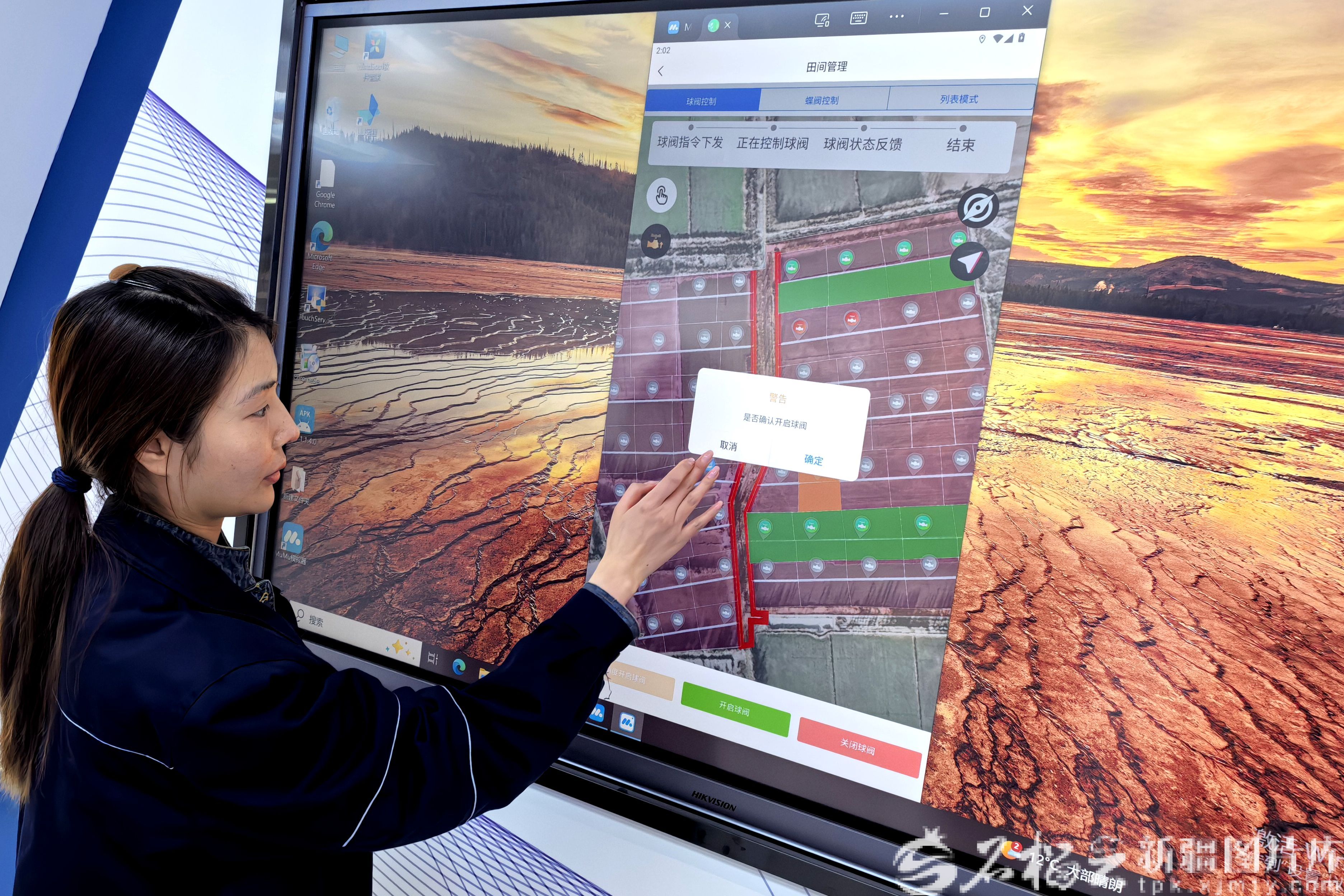 4月14日,新疆新侨智慧能源有限公司工作人员通过新农宝APP远程操作,展示精准滴灌、智能施肥与阀门调控等水肥一体化管理。