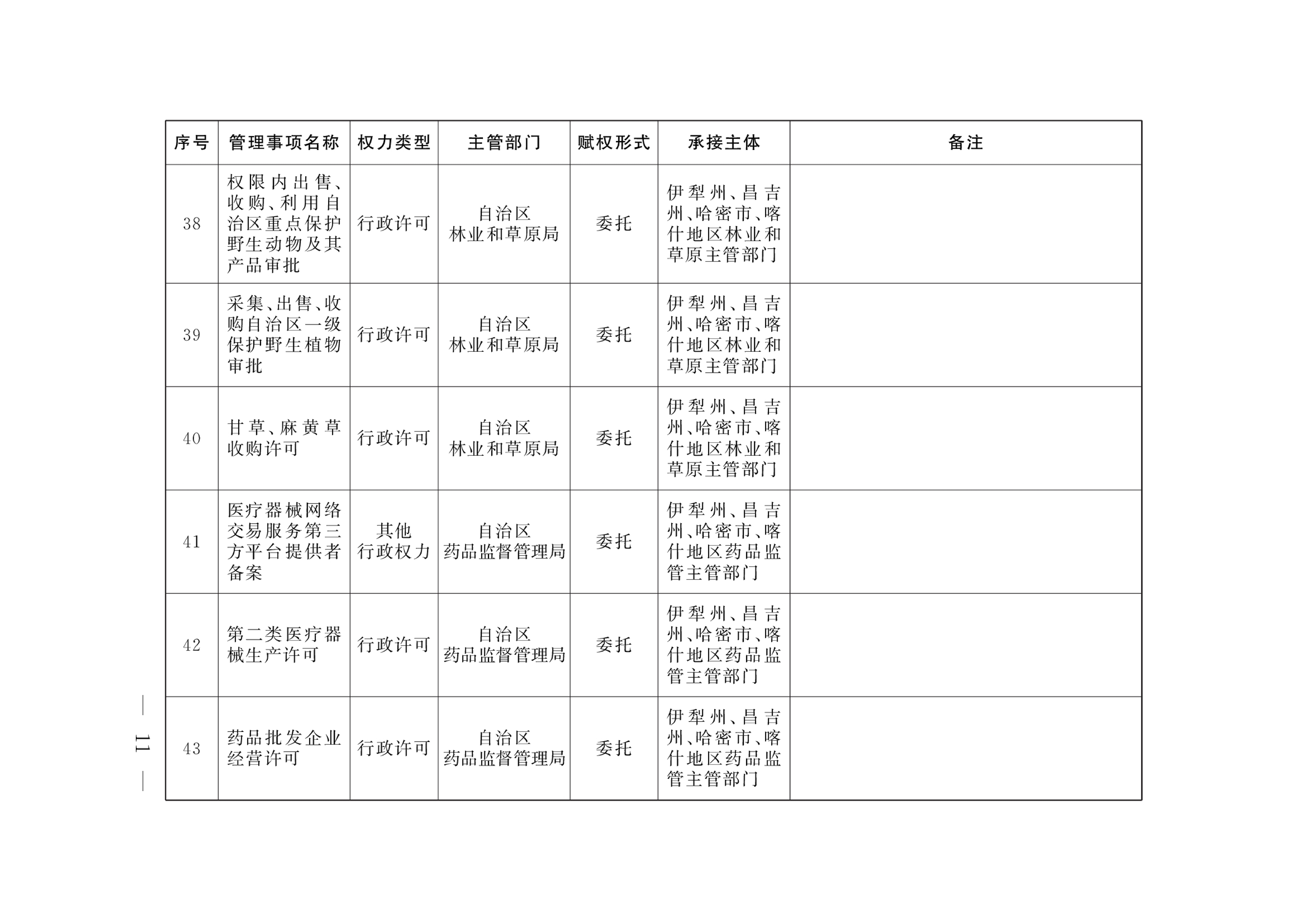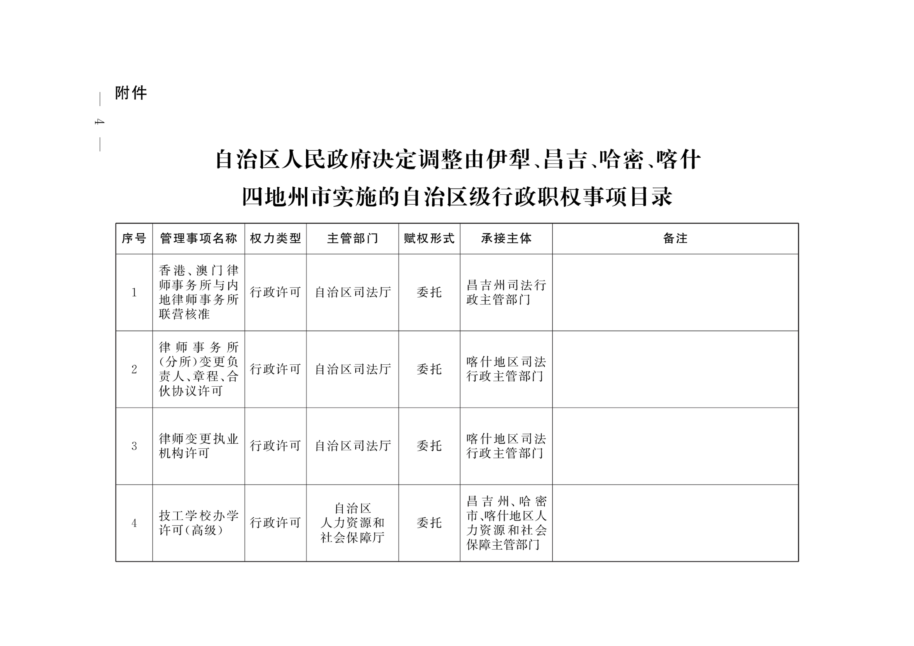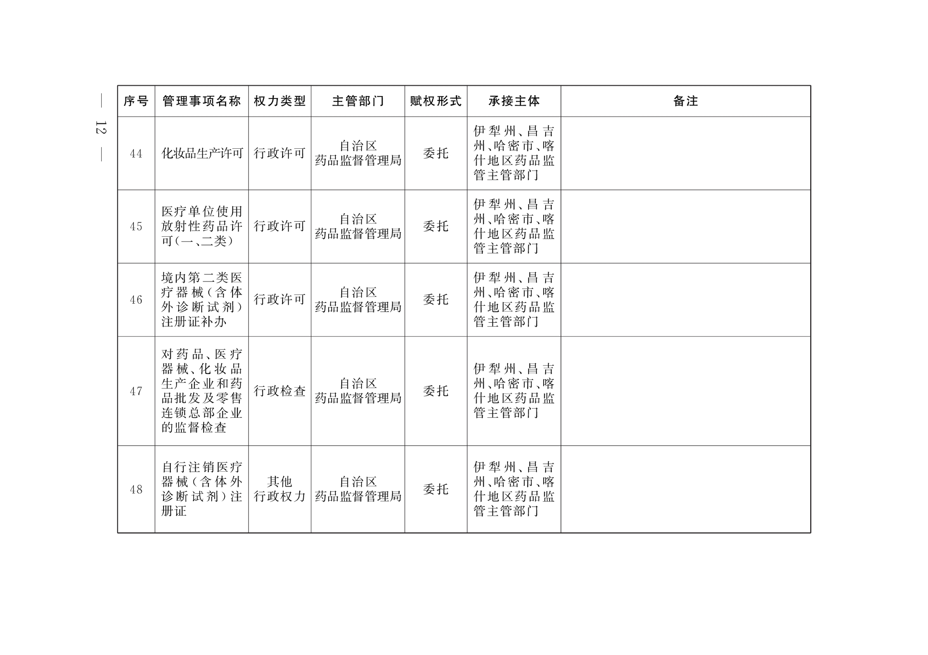 为进一步转变政府职能,提高行政效能,激发市场活力和社会创造力,依据《中华人民共和国行政许可法》等法律、法规,结合工作实际,自治区人民政府决定将48项自治区级行政职权事项调整由伊犁、昌吉、哈密、喀什四地州市实施。自治区有关部门和四地州市要依照职权认真组织实施,加强衔接沟通,确保相关自治区级行政职权放得下、接得住、管得好、有监督。